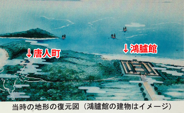 唐人町の歴史は一説には弥生時代までさかのぼるとも言われています。(※画像は鴻臚館案内板より)
